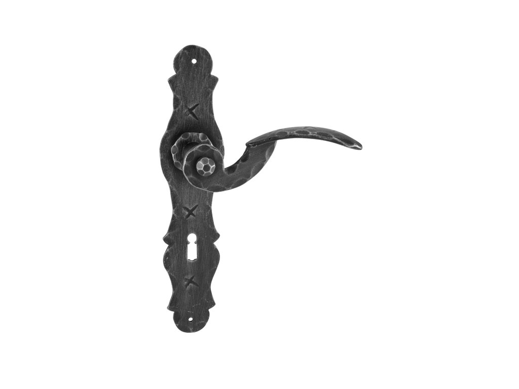Štítová kľučka na interiérové dvere s kovaným štítom je vyrobená z kovaného železa a je povrchovo upravená. Kľučka neobsahuje vratný mechanizmus.