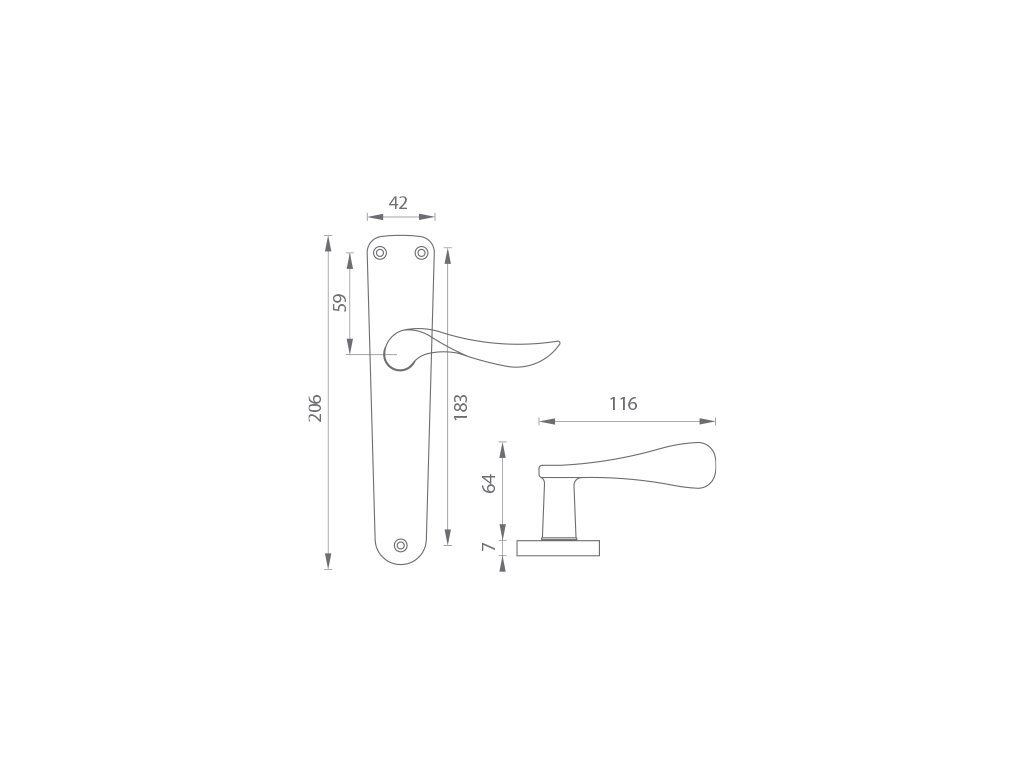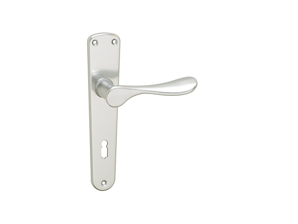 Štítová kľučka na interiérové dvere s oválnym štítom je vyrobená z hliníka a je povrchovo upravená. Oválny štít má rozmery 42 mm x 206 mm a kľučka neobsahuje vratný mechanizmus.