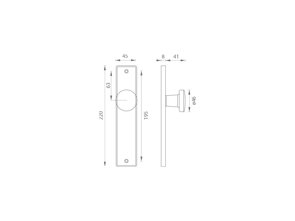 Dverová pevná priama guľa na hranatom štíte je vyrobená z hliníka a je povrchovo upravená. Guľa má priemer 46 mm a hranatý štít má rozmery 45 mm x 220 mm a hrúbku 8 mm. Používaný pri modeli VIENNA. Je to len na Vašom rozhodnutí, aký typ otvoru si vyberiete z našej širokej ponuky. V prípade, že sa neviete rozhodnúť, radi Vám poradíme a pomôžeme s výberom.Dodatočné parametre