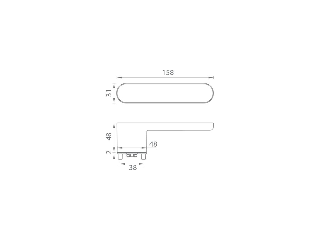 Rozetová kľučka na interiérové dvere s obdĺžnikovou rozetou je vyrobená z materiálov vysokej kvality - zamak a je povrchovo upravená. Rozeta má rozmery 48 mm x 31 mm a hrúbku 2 mm. Samotná rozeta je súčasťou dizajnu kľučky.