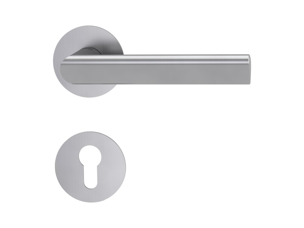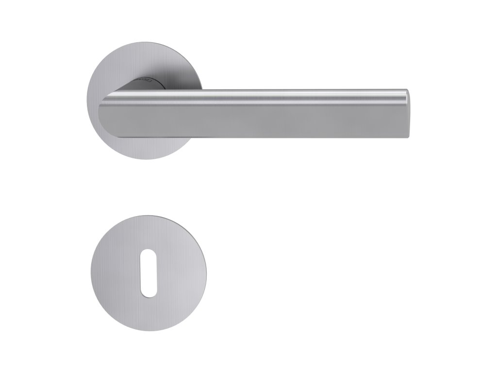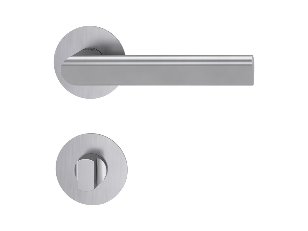 Rozetová kľučka TRI 134 PIATTA S na interiérové dvere s okrúhlou rozetou je vyrobená z vysokokvalitnej nehrdzavejúcej ocele, známej ako nerez a je povrchovo upravená. Rozeta má priemer 54 mm a hrúbku 2 mm.