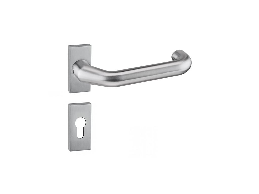 Kľučka na interiérové dvere s úzkou hranatou rozetou je vyrobená z kvalitnej nehrdzavejúcej ocele s povrchovou úpravou.