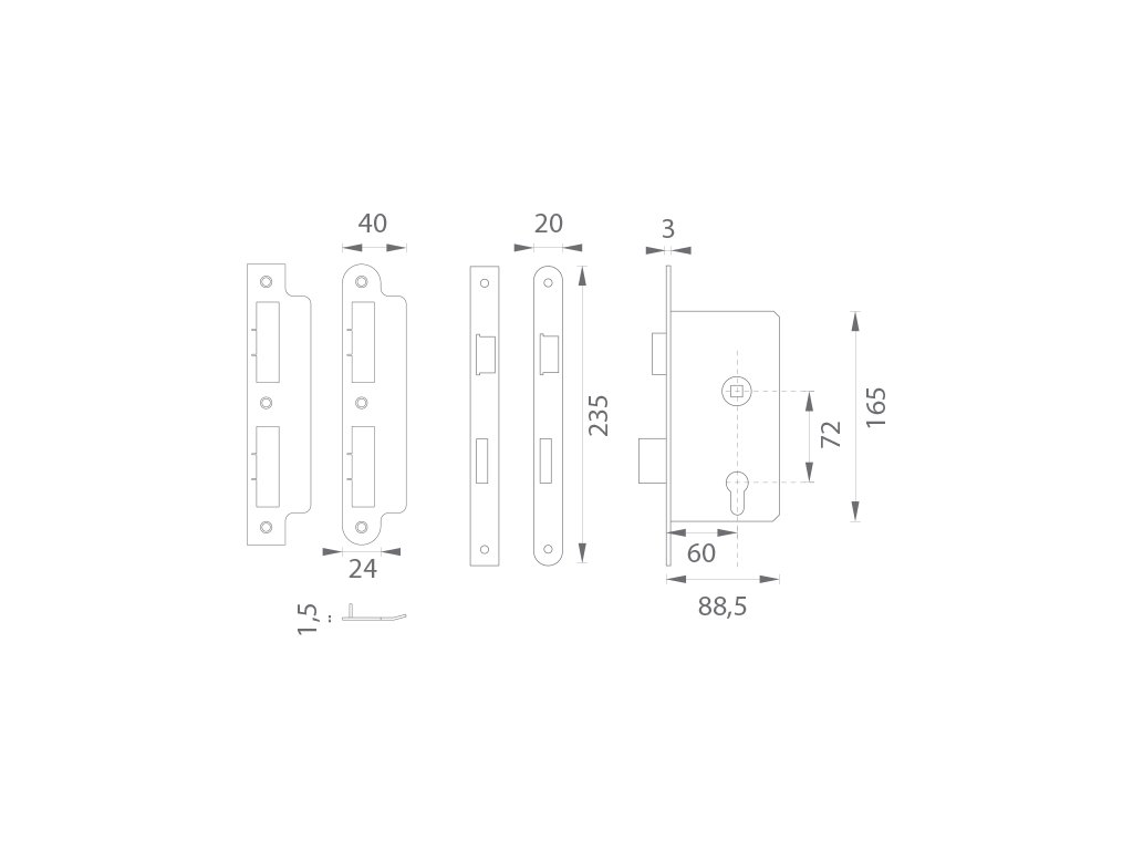 Panikový hranatý zámok s bezpečnostnou funkciou "D" pre kovanie kľučka/kľučka s rozmermi čela zámku v dĺžke 235 mm, šírke 20 mm, hrúbke 3 mm. Rozteč (vzdialenosť medzi otvorom na kľučku a vložkou/kľúčom) - 72 mm , zádlab - 88,5 mm a dormas (vzdialenosť osi kľučky od lišty zámku) - 60 mm.