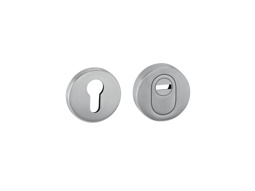 Bezpečnostná okrúhla rozeta s prekrytím cylindrickej vložky je vyrobená z nehrdzavejúcej ocele a a je povrchovo upravená.