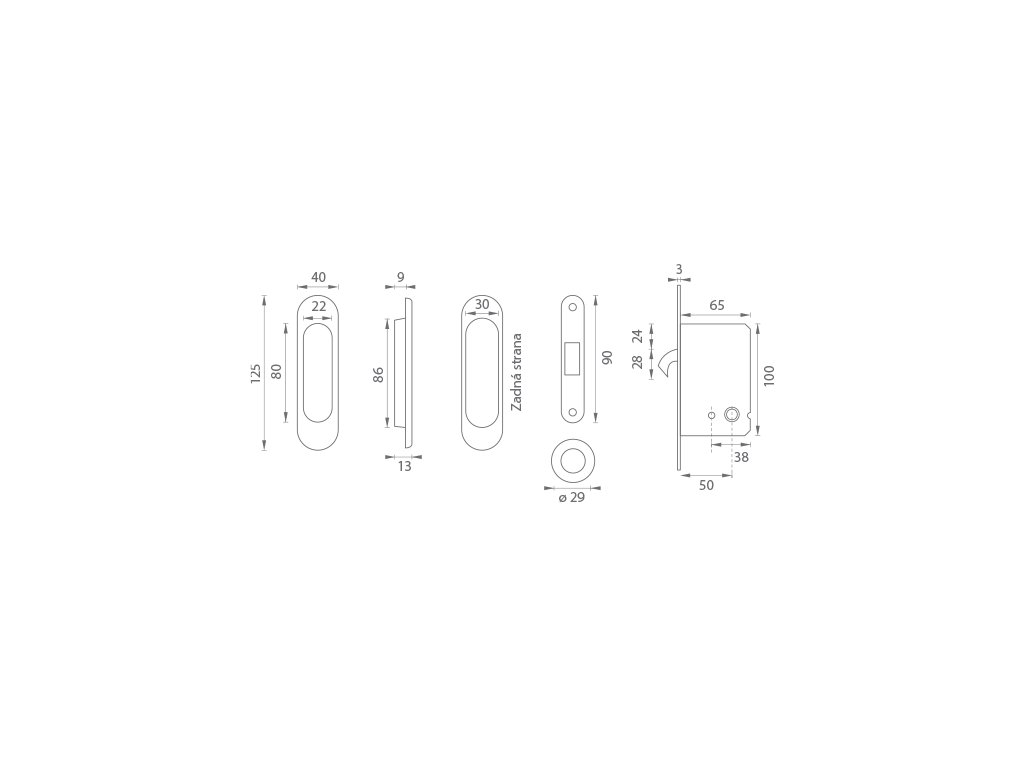 Okrúhly set na posuvné dvere s WC kľúčom - Rozteč (vzdialenosť medzi otvorom na kľučku a vložkou/kľúčom) - 90 mm , zádlab - 65 mm a dormas (vzdialenosť osi kľučky od lišty zámku) - 50 mm.