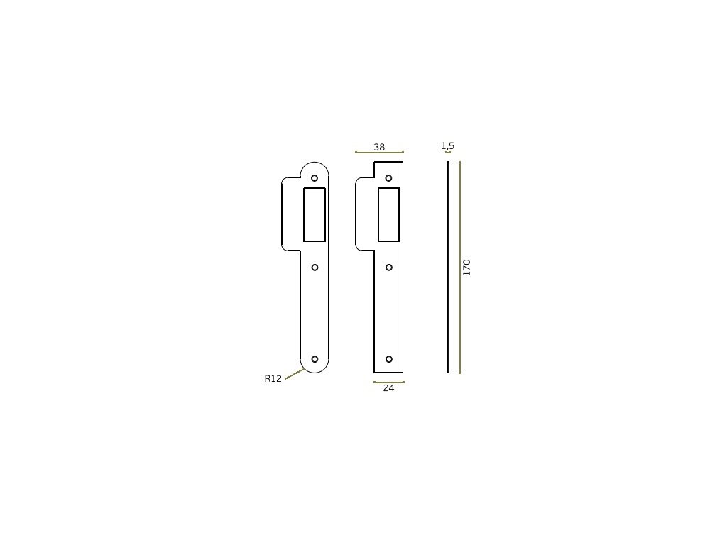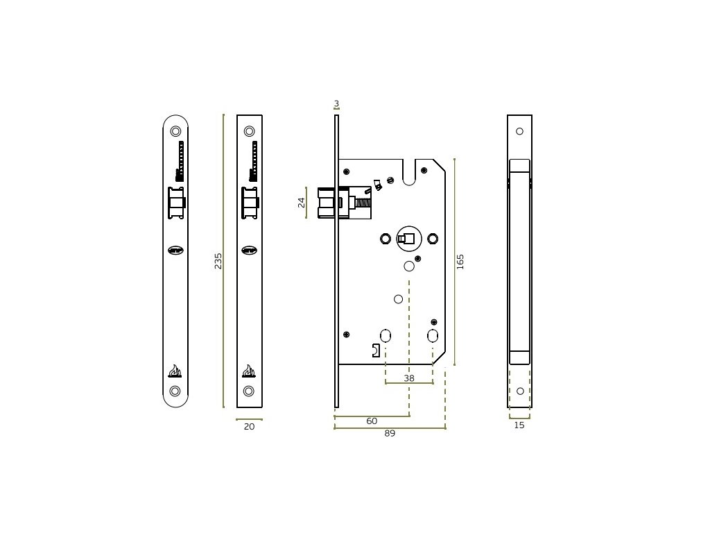 Zadlabávací zámok do prechodových dverí s rozmermi čela zámku v dĺžke 235 mm, šírke 20 mm, hrúbke 3 mm.