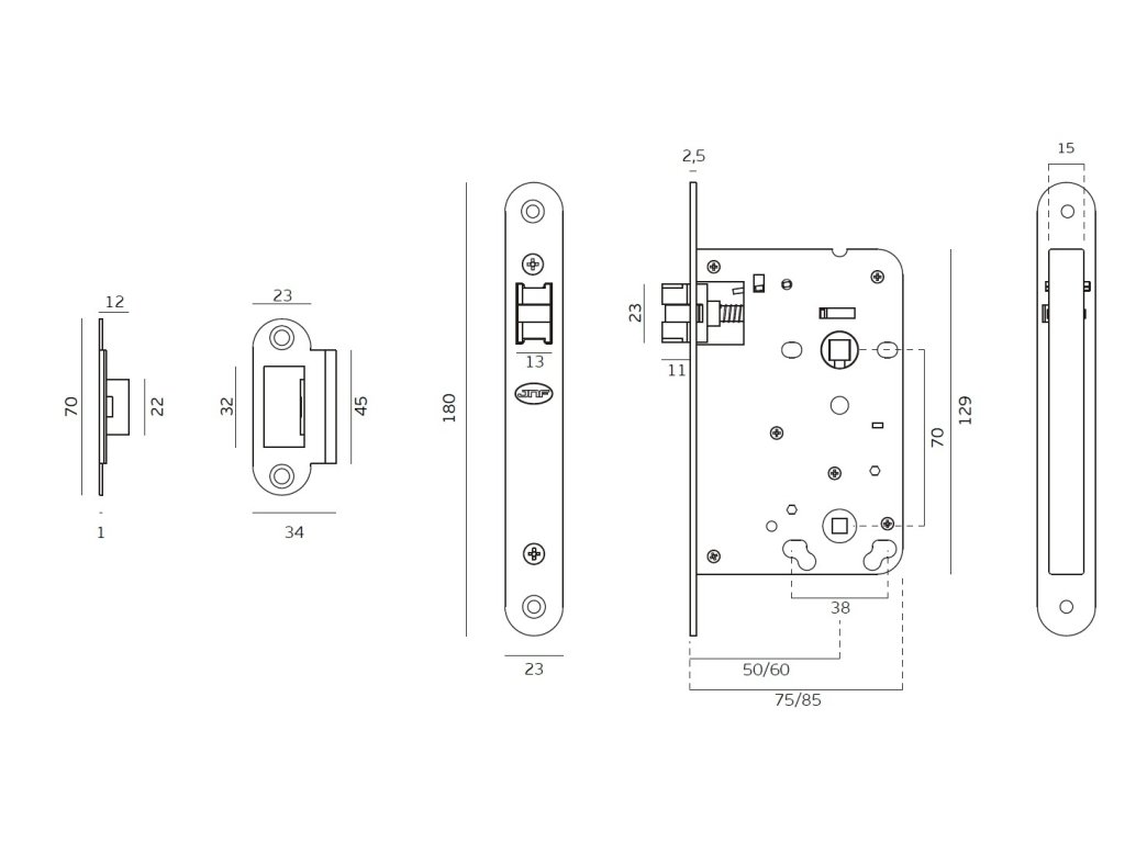Rozteč (vzdialenosť medzi otvorom na kľučku a vložkou/kľúčom) - 70 mm , zádlab - 75 mm a dormas (vzdialenosť osi kľučky od lišty zámku) - 50 mm.