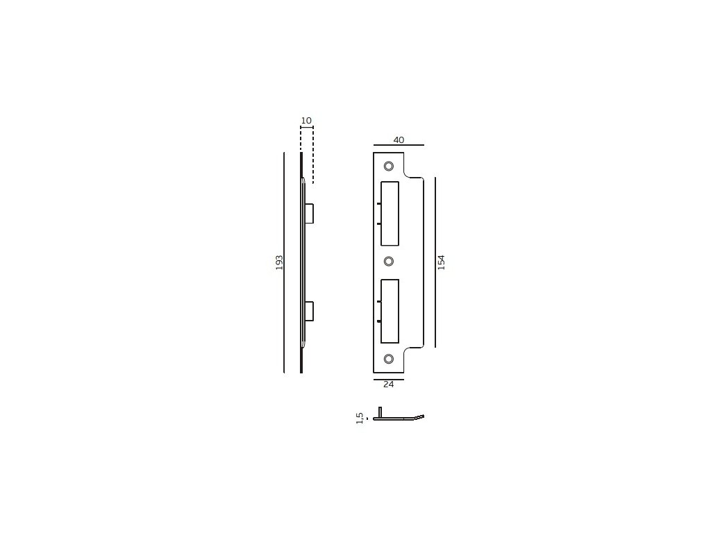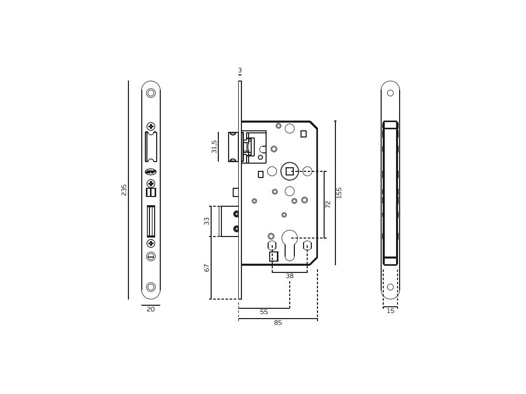 Panikový oválny zámok s bezpečnostnou funkciou "E" pre kovanie guľa/kľučka s rozmermi čela zámku v dĺžke 235 mm, šírke 20 mm, hrúbke 3 mm. Rozteč (vzdialenosť medzi otvorom na kľučku a vložkou/kľúčom) - 72 mm , zádlab - 85 mm a dormas (vzdialenosť osi kľučky od lišty zámku) - 55 mm.