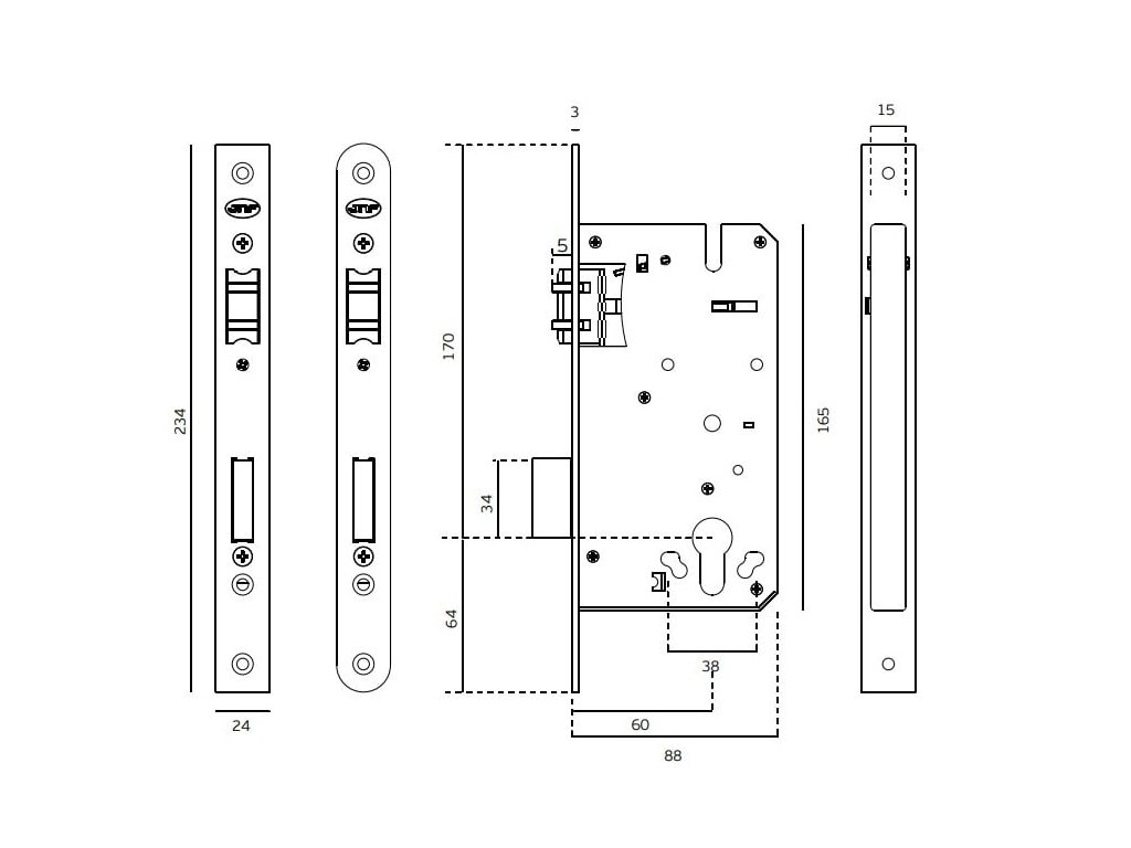 Rozteč (vzdialenosť medzi otvorom na kľučku a vložkou/kľúčom) - 72 mm , zádlab - 88 mm a dormas (vzdialenosť osi kľučky od lišty zámku) - 60 mm.
