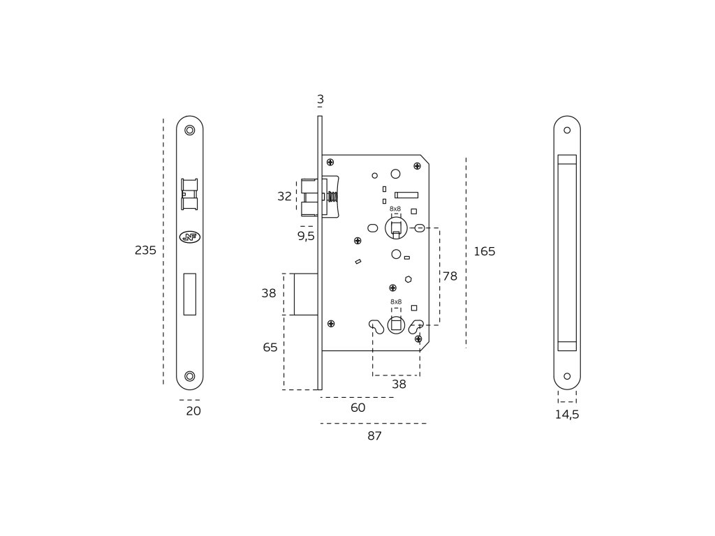 Rozteč (vzdialenosť medzi otvorom na kľučku a vložkou/kľúčom) - 78 mm , zádlab - 87 mm a dormas (vzdialenosť osi kľučky od lišty zámku) - 60 mm.