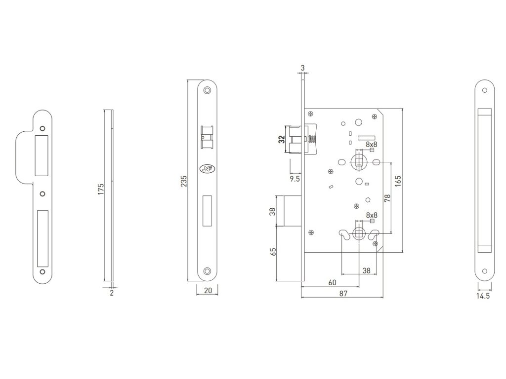 Rozteč (vzdialenosť medzi otvorom na kľučku a vložkou/kľúčom) - 78 mm , zádlab - 87 mm a dormas (vzdialenosť osi kľučky od lišty zámku) - 60 mm.