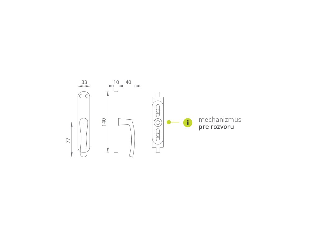 Rozvora na drevené okno s mechanizmom a s oválnou rozetou je vyrobená z hliníka a je povrchovo upravená. Rozeta má rozmery 33 mm x 140 mm a hrúbku 10 mm.Upevnenie samoreznou skrutkou - Súčasťou balenia sú samorezné skrutky v príslušnom počte.