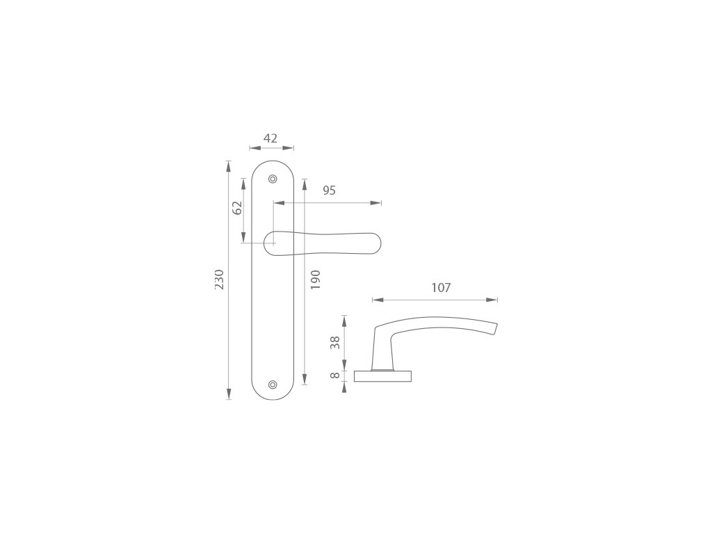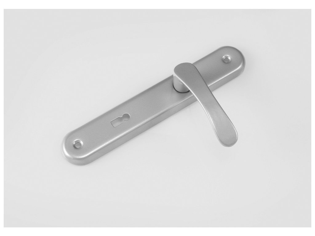 Štítová kľučka na interiérové dvere s oválnym štítom je vyrobená z hliníka a je povrchovo upravená. Kľučka neobsahuje vratný mechanizmus.