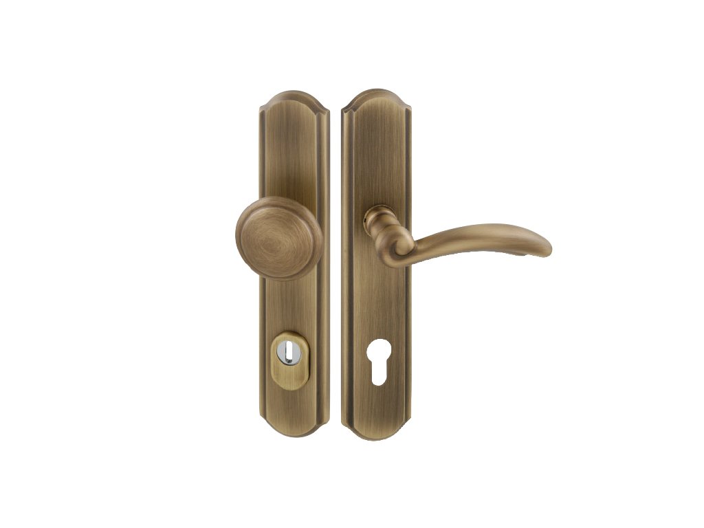 Štítová kľučka na vchodové a bezpečnostné dvere so spevneným rustikálnym štítom s prekrytím cylindrickej vložky je vyrobená z materiálov vysokej kvality – mosadz a je povrchovo upravená. Rustikálny štít má rozmery 51 mm x 250 mm a hrúbku 12 mm.