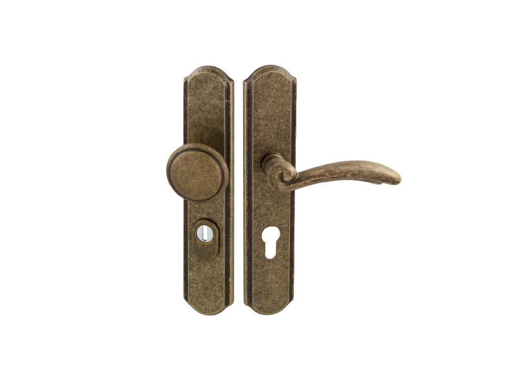 Štítová kľučka na vchodové a bezpečnostné dvere so spevneným rustikálnym štítom s prekrytím cylindrickej vložky je vyrobená z materiálov vysokej kvality – mosadz a je povrchovo upravená. Rustikálny štít má rozmery 51 mm x 250 mm a hrúbku 12 mm.