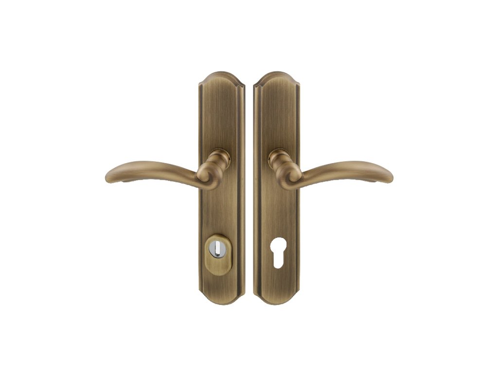 Štítová kľučka na vchodové a bezpečnostné dvere so spevneným rustikálnym štítom s prekrytím cylindrickej vložky je vyrobená z materiálov vysokej kvality – mosadz a je povrchovo upravená. Rustikálny štít má rozmery 51 mm x 250 mm a hrúbku 12 mm.