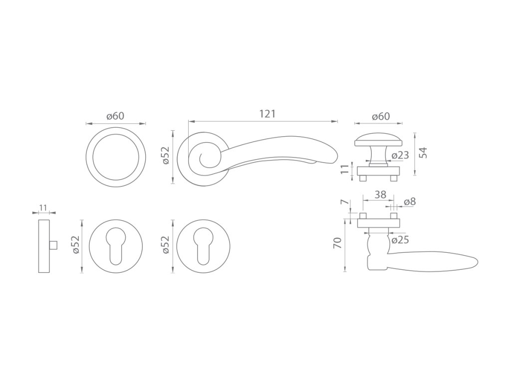 Rozetová kľučka na vchodové a bezpečnostné dvere so spevnenou okrúhlou rozetou bez prekrytia cylindrickej vložky je vyrobená z materiálov vysokej kvality – mosadz a je povrchovo upravená. Okrúhla rozeta má priemer 52 mm a hrúbku 11 mm.