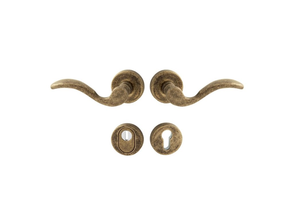 Rozetová kľučka na vchodové a bezpečnostné dvere so spevnenou okrúhlou rozetou s prekrytím cylindrickej vložky je vyrobená z materiálov vysokej kvality – mosadz a je povrchovo upravená. Okrúhla rozeta má priemer 52 mm a hrúbku 11 mm.