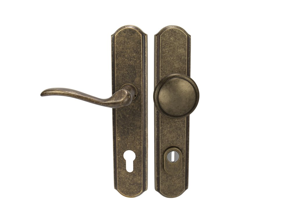 Štítová kľučka na vchodové a bezpečnostné dvere so spevneným rustikálnym štítom s prekrytím cylindrickej vložky je vyrobená z materiálov vysokej kvality – mosadz a je povrchovo upravená. Rustikálny štít má rozmery 51 mm x 250 mm a hrúbku 12 mm.