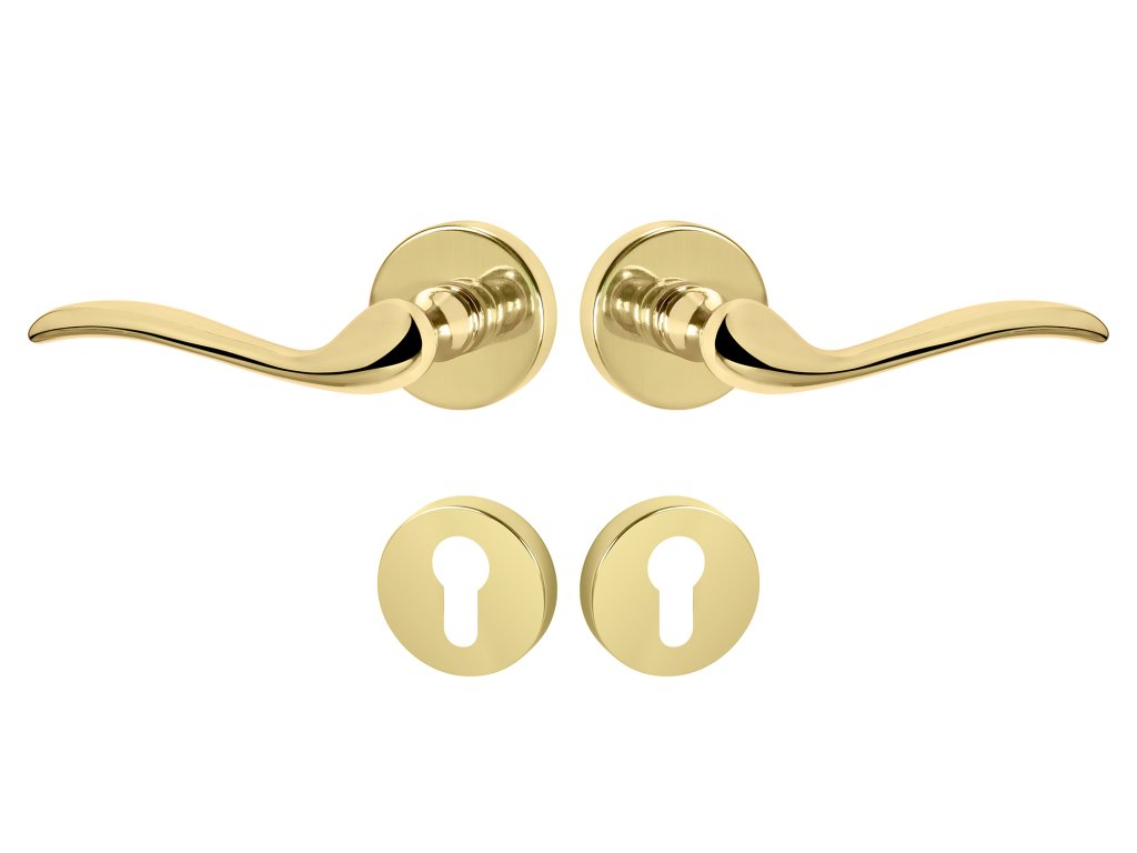 Rozetová kľučka na vchodové a bezpečnostné dvere so spevnenou okrúhlou rozetou bez prekrytia cylindrickej vložky je vyrobená z materiálov vysokej kvality – mosadz a je povrchovo upravená. Okrúhla rozeta má