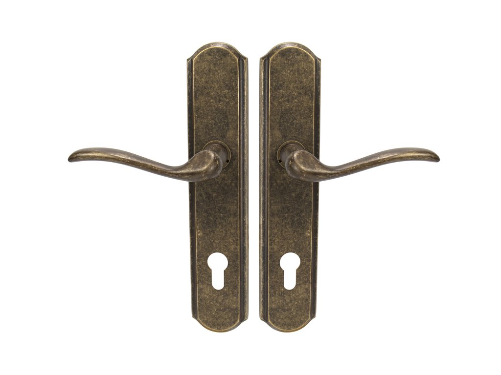 Štítová kľučka na vchodové a bezpečnostné dvere so spevneným rustikálnym štítom bez prekrytia cylindrickej vložky je vyrobená z materiálov vysokej kvality – mosadz a je povrchovo upravená. Rustikálny štít má rozmery 51 mm x 250 mm a hrúbku 12 mm.