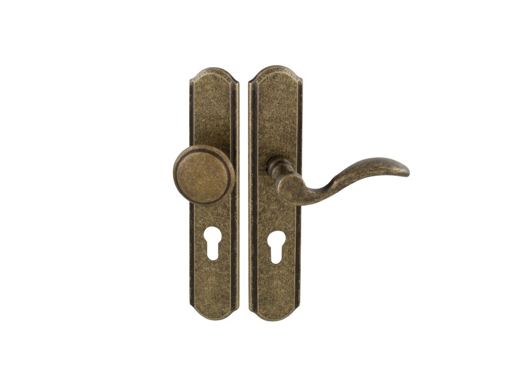 Štítová kľučka na vchodové a bezpečnostné dvere so spevneným rustikálnym štítom bez prekrytia cylindrickej vložky je vyrobená z materiálov vysokej kvality – mosadz a je povrchovo upravená. Rustikálny štít má rozmery 51 mm x 250 mm a hrúbku 12 mm.