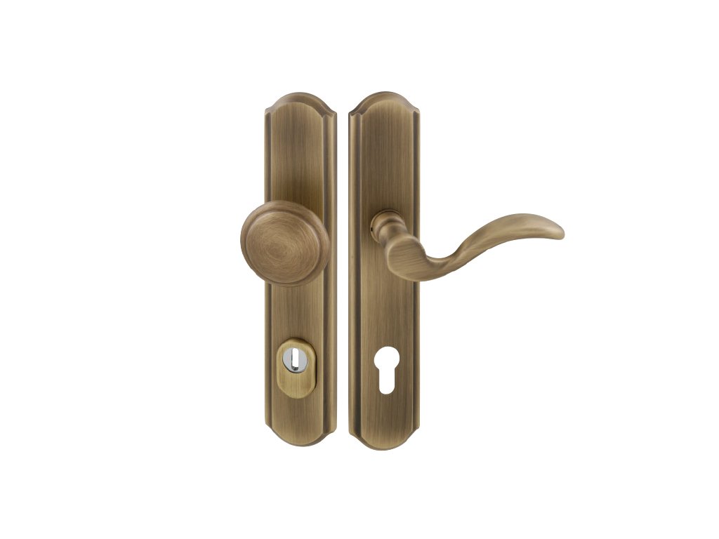 Štítová kľučka na vchodové a bezpečnostné dvere so spevneným rustikálnym štítom s prekrytím cylindrickej vložky je vyrobená z materiálov vysokej kvality – mosadz a je povrchovo upravená. Rustikálny štít má rozmery 51 mm x 250 mm a hrúbku 12 mm.