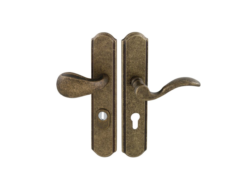 Štítová kľučka na vchodové a bezpečnostné dvere so spevneným rustikálnym štítom s prekrytím cylindrickej vložky je vyrobená z materiálov vysokej kvality – mosadz a je povrchovo upravená. Rustikálny štít má rozmery 51 mm x 250 mm a hrúbku 12 mm.