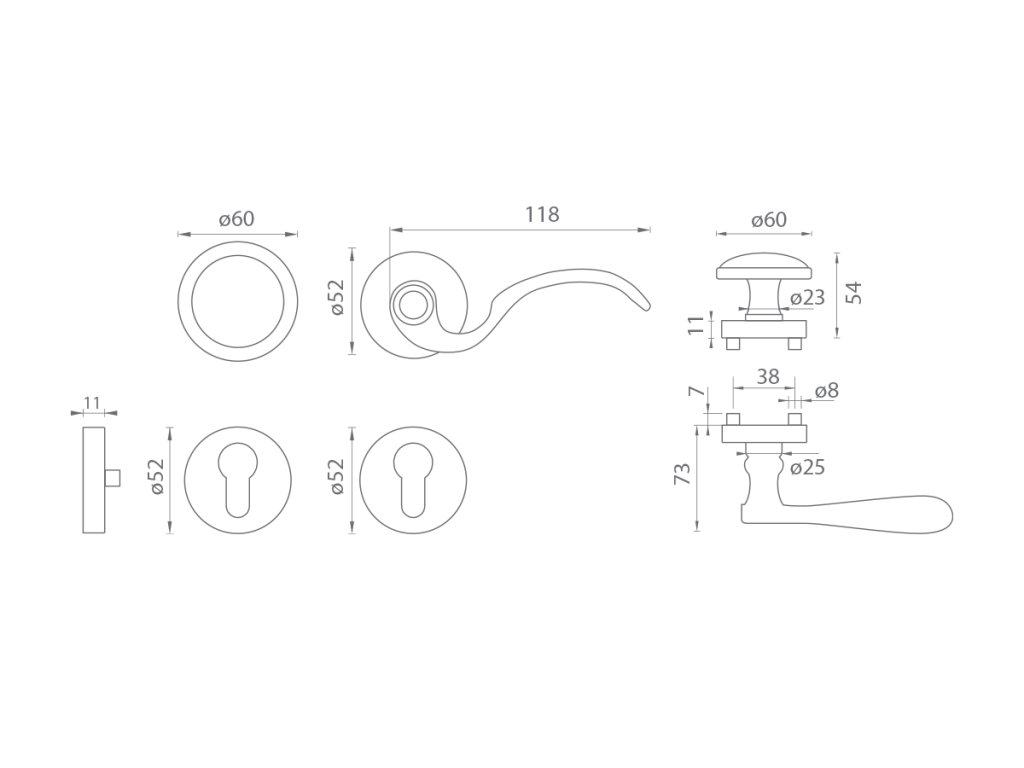 Rozetová kľučka na vchodové a bezpečnostné dvere so spevnenou okrúhlou rozetou s prekrytím cylindrickej vložky je vyrobená z materiálov vysokej kvality – mosadz a je povrchovo upravená. Okrúhla rozeta má priemer 52 mm a hrúbku 11 mm.
