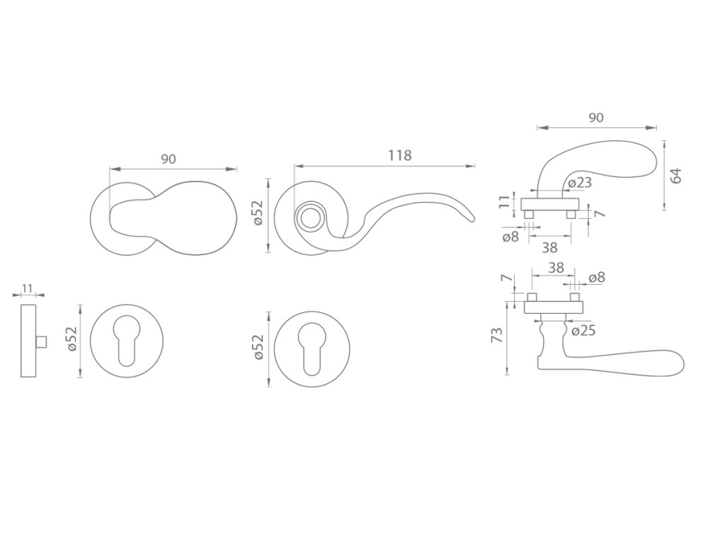Rozetová kľučka na vchodové a bezpečnostné dvere so spevnenou okrúhlou rozetou bez prekrytia cylindrickej vložky je vyrobená z materiálov vysokej kvality – mosadz a je povrchovo upravená. Okrúhla rozeta má priemer 52 mm a hrúbku 11 mm.