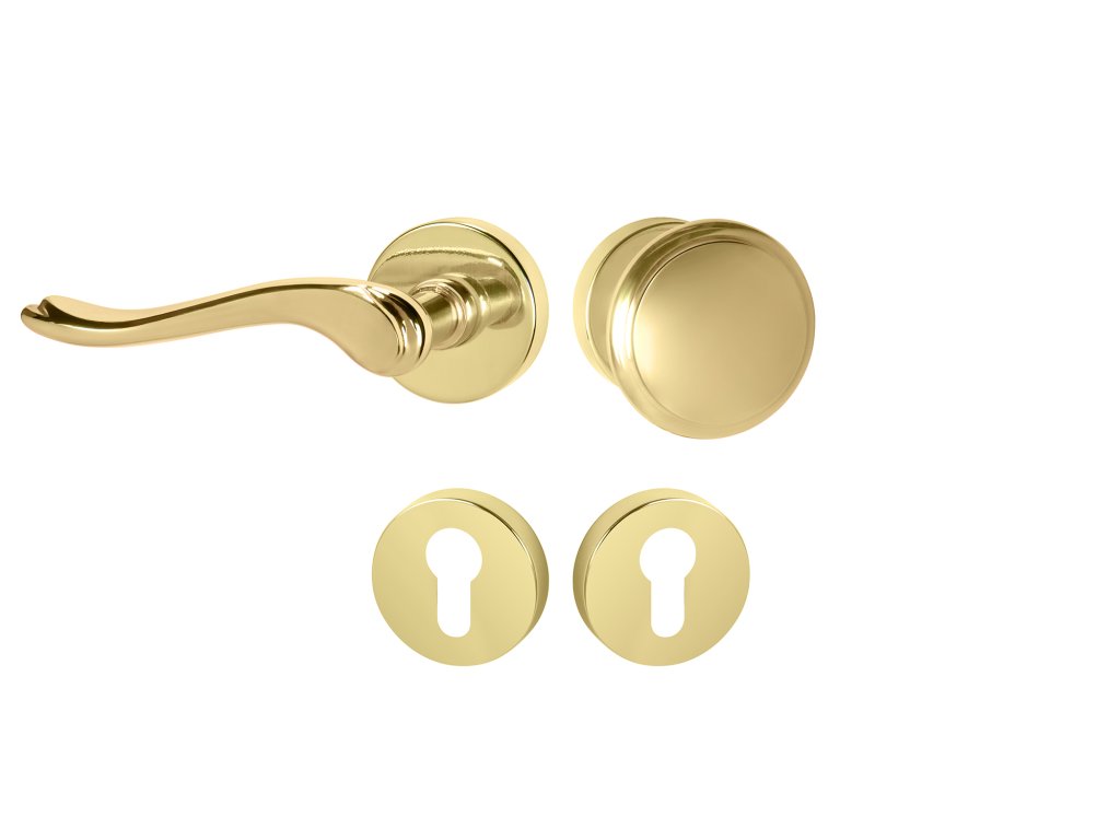 Rozetová kľučka na vchodové a bezpečnostné dvere so spevnenou okrúhlou rozetou bez prekrytia cylindrickej vložky je vyrobená z materiálov vysokej kvality – mosadz a je povrchovo upravená.