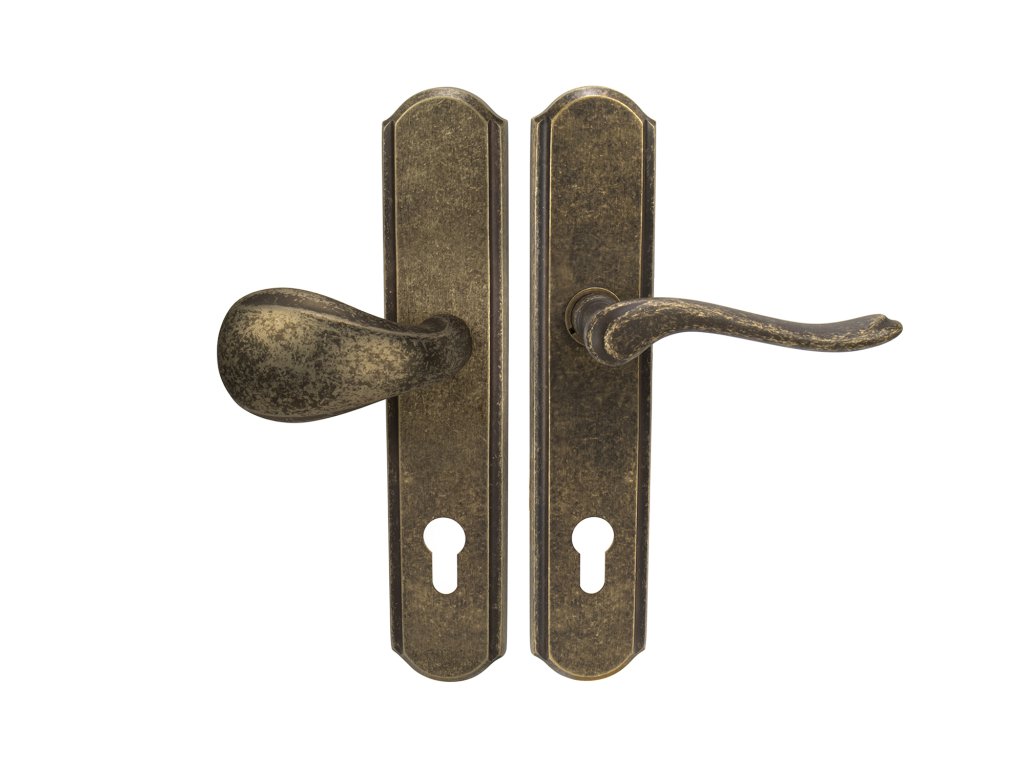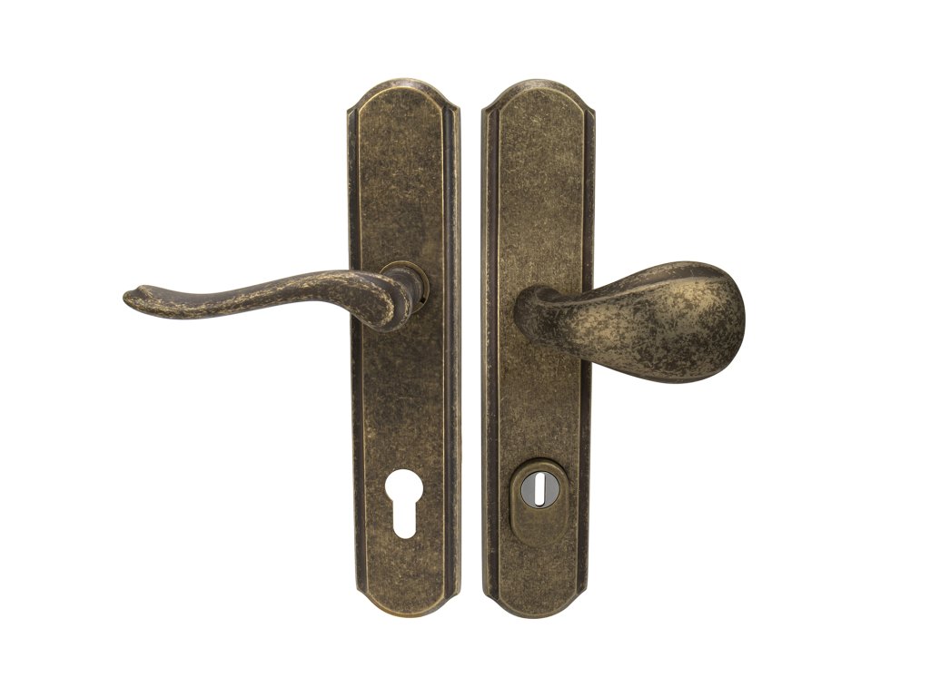 Štítová kľučka na vchodové a bezpečnostné dvere so spevneným rustikálnym štítom bez prekrytia cylindrickej vložky je vyrobená z materiálov vysokej kvality – mosadz a je povrchovo upravená. Rustikálny štít má rozmery 51 mm x 250 mm a hrúbku 12 mm.