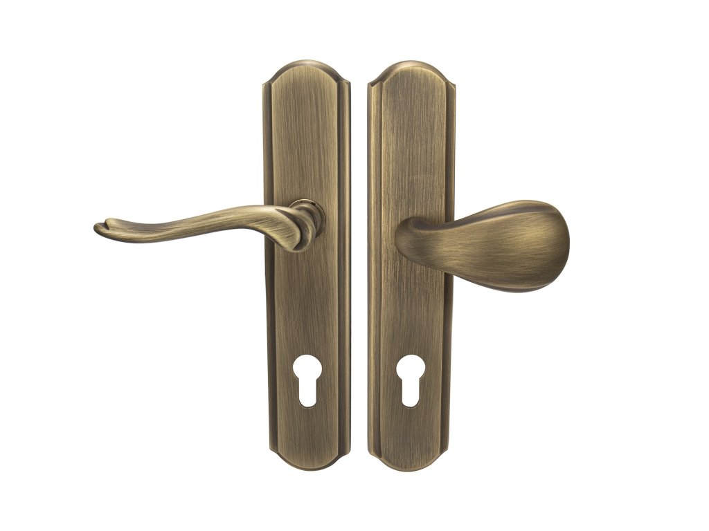Štítová kľučka na vchodové a bezpečnostné dvere so spevneným rustikálnym štítom bez prekrytia cylindrickej vložky je vyrobená z materiálov vysokej kvality – mosadz a je povrchovo upravená. Rustikálny štít má rozmery 51 mm x 250 mm a hrúbku 12 mm.
