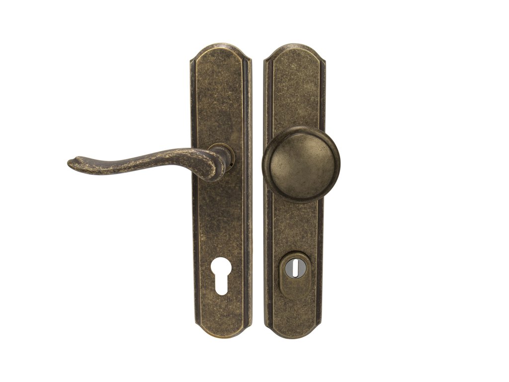 Štítová kľučka na vchodové a bezpečnostné dvere so spevneným rustikálnym štítom s prekrytím cylindrickej vložky je vyrobená z materiálov vysokej kvality – mosadz a je povrchovo upravená. Rustikálny štít má rozmery 51 mm x 250 mm a hrúbku 12 mm.