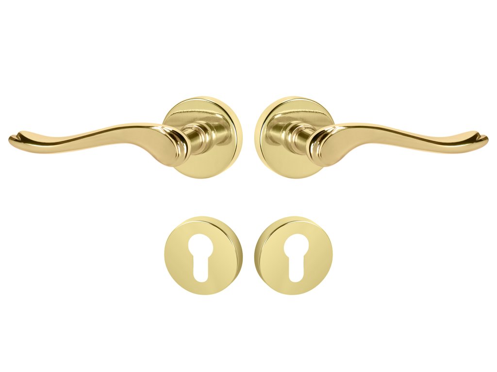 Rozetová kľučka na vchodové a bezpečnostné dvere so spevnenou okrúhlou rozetou bez prekrytia cylindrickej vložky je vyrobená z materiálov vysokej kvality – mosadz a je povrchovo upravená. Okrúhla rozeta má