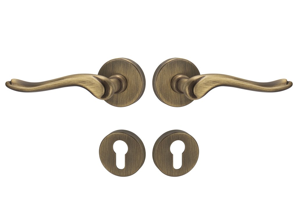 Rozetová kľučka na vchodové a bezpečnostné dvere so spevnenou okrúhlou rozetou bez prekrytia cylindrickej vložky je vyrobená z materiálov vysokej kvality – mosadz a je povrchovo upravená. Okrúhla rozeta má