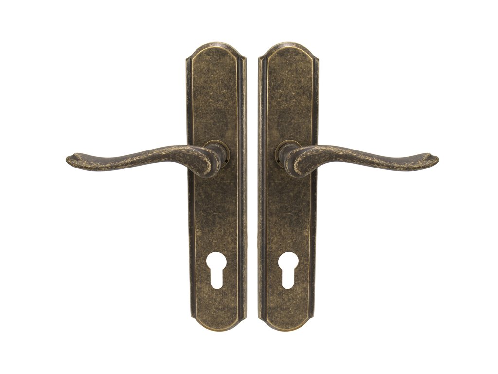 Štítová kľučka na vchodové a bezpečnostné dvere so spevneným rustikálnym štítom bez prekrytia cylindrickej vložky je vyrobená z materiálov vysokej kvality – mosadz a je povrchovo upravená. Rustikálny štít má rozmery 51 mm x 250 mm a hrúbku 12 mm.