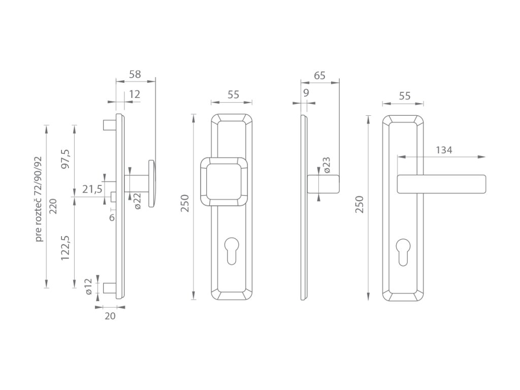Štítová kľučka na vchodové a bezpečnostné dvere so spevneným hranatým štítom bez prekrytia cylindrickej vložky je vyrobená z materiálov vysokej kvality – mosadz a je povrchovo upravená. Hranatý štít má rozmery 55 mm x 250 mm a hrúbku 12 mm.