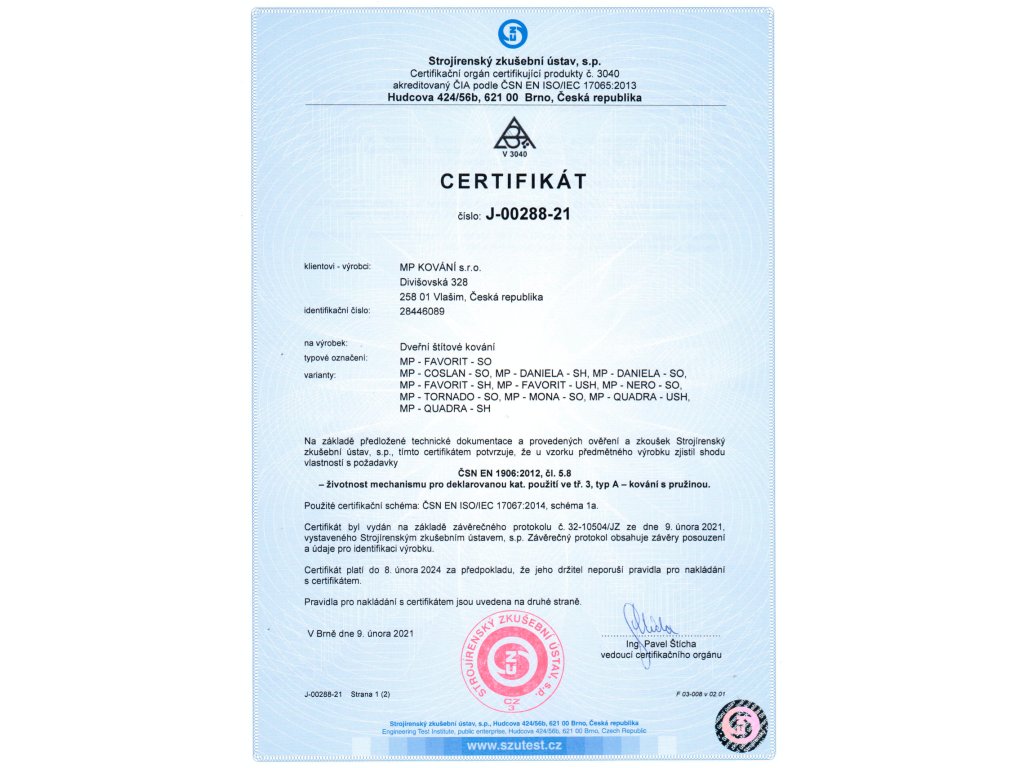 Štítová kľučka na interiérové dvere s oválnym štítom je vyrobená z vysokokvalitnej nehrdzavejúcej ocele, známej ako nerez a je povrchovo upravená. Kľučka z rady MP line obsahuje vratný mechanizmus v puzdre z pozinkovanej ocele. Vyznačuje sa vysokou odolnosťou voči opotrebeniu a farebnou stálosťou. Je vhodná pre prostredie s vysokou frekvenciou pohybu ľudí. Kľučka je testovaná podľa normy ČSN EN 1906:2012 na 200 000 cyklov.
