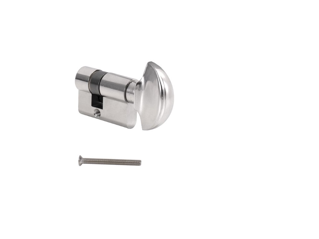 Cylindrická vložka s gombíkom pre kovanie na sklo je vyrobená z materiálov vysokej kvality - mosadz a je povrchovo upravená. Takmer identická ako stavebná cylindrická vložka, ale z vnútornej strany je namiesto kľúča ovládací gombík, ktorý umožňuje jednoduché ovládanie zámku a nebráni použitiu kľúča zvonku.