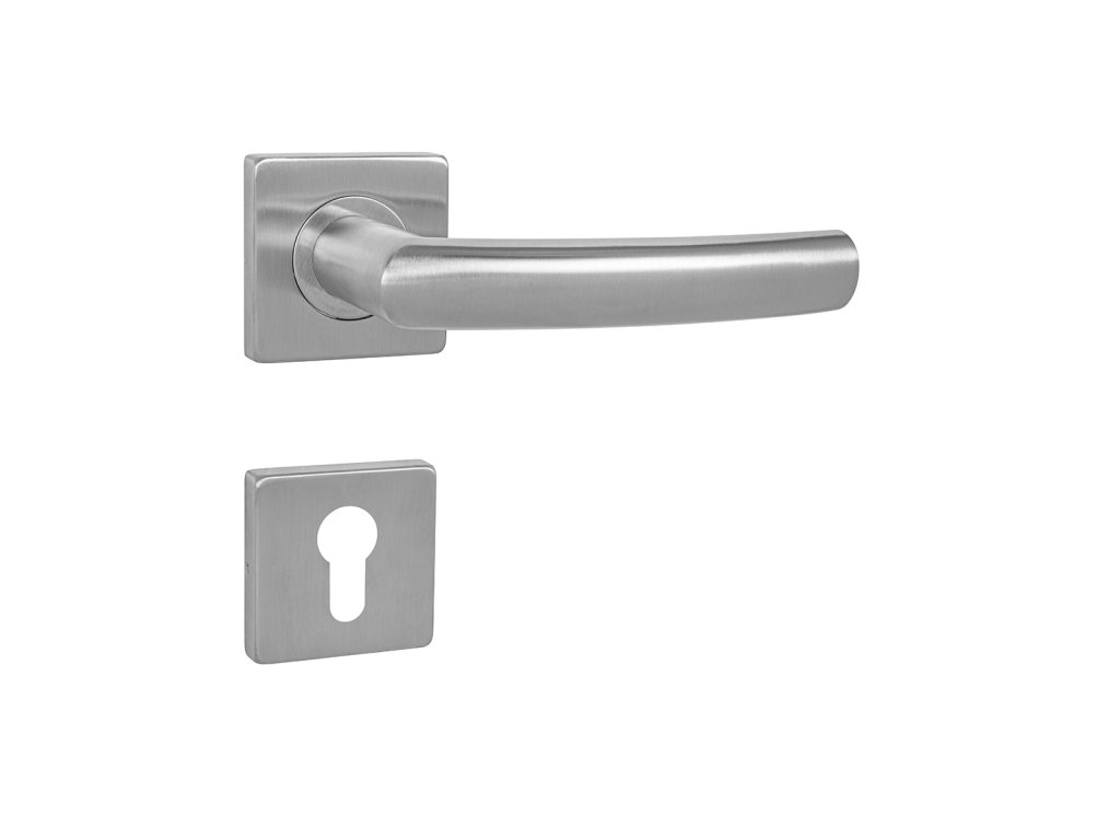 Rozetová kľučka na interiérové dvere s hranatou rozetou je vyrobená z vysokokvalitnej nehrdzavejúcej ocele, známej ako nerez a je povrchovo upravená. Rozeta má rozmery 54 mm x 54 mm a hrúbku 9 mm. Je farebne stabilná a odolná voči opotrebeniu. Kovanie je testované podľa normy ČSN EN 1906:2012 na 200 000 cyklov.