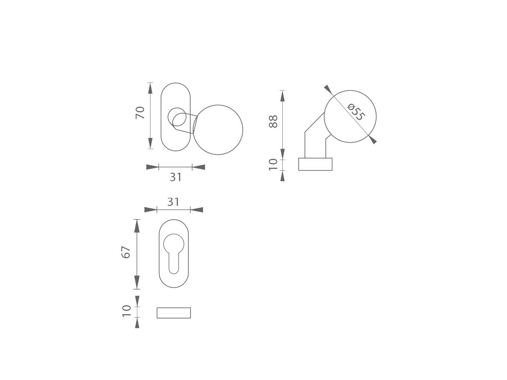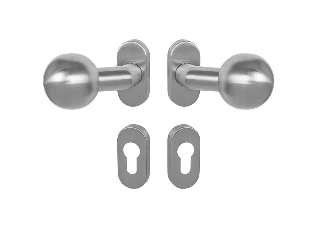 Dverová vyosená guľa na úzkej oválnej rozete je vyrobená z vysokokvalitnej nehrdzavejúcej ocele, známej ako nerez a je povrchovo upravená. Guľa pre dvere s úzkym profilom má priemer 55 mm a úzka oválna rozeta má rozmery 31 mm x 70 mm. Rozeta s PZ otvorom pre vložku má rozmery 31 mm x 67 mm a hrúbku 10 mm.