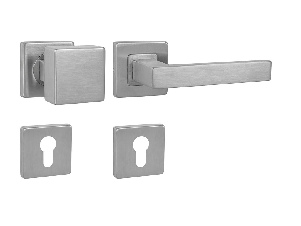 Rozetová kľučka na interiérové dvere s hranatou rozetou je vyrobená z vysokokvalitnej nehrdzavejúcej ocele, známej ako nerez a je povrchovo upravená. Rozeta má rozmery 54 mm x 54 mm a hrúbku 9 mm. Je farebne stabilná a odolná voči opotrebeniu. Kovanie je testované podľa normy ČSN EN 1906:2012 na 200 000 cyklov.
