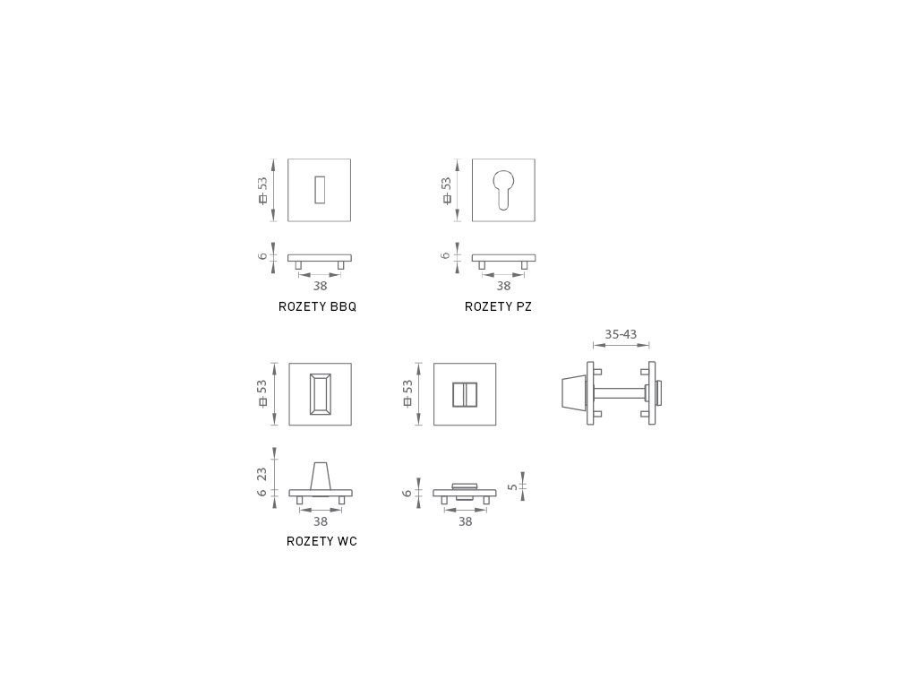 Hranatá rozeta je vyrobená z materiálov vysokej kvality - zamak a je povrchovo upravená. Rozeta má rozmery 53 mm x 53 mm, hrúbku len 6 mm a hranatý otvor pre interiérový klúč (BBQ), otvor pre cylindrickú vložku (PZ) alebo WC set s vmontovaným kľúčom. Balenie obsahuje 2 kusy roziet (pár) a rozety WC sú v balení ako set.