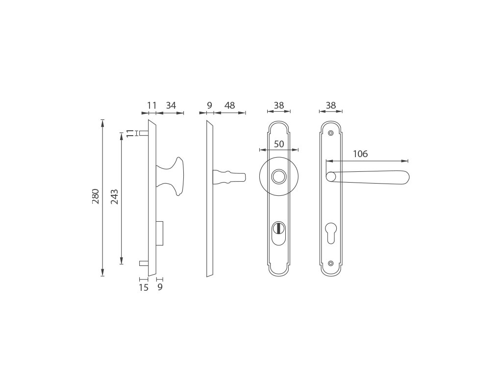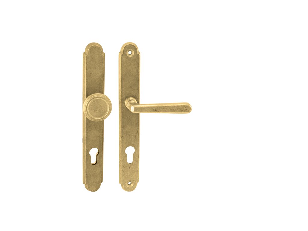 Štítová kľučka na vchodové a bezpečnostné dvere so spevneným rustikálnym štítom bez prekrytia cylindrickej vložky je vyrobená z materiálov vysokej kvality – mosadz a je povrchovo upravená. Rustikálny štít má rozmery 38 mm x 280 mm a hrúbku 11 mm.