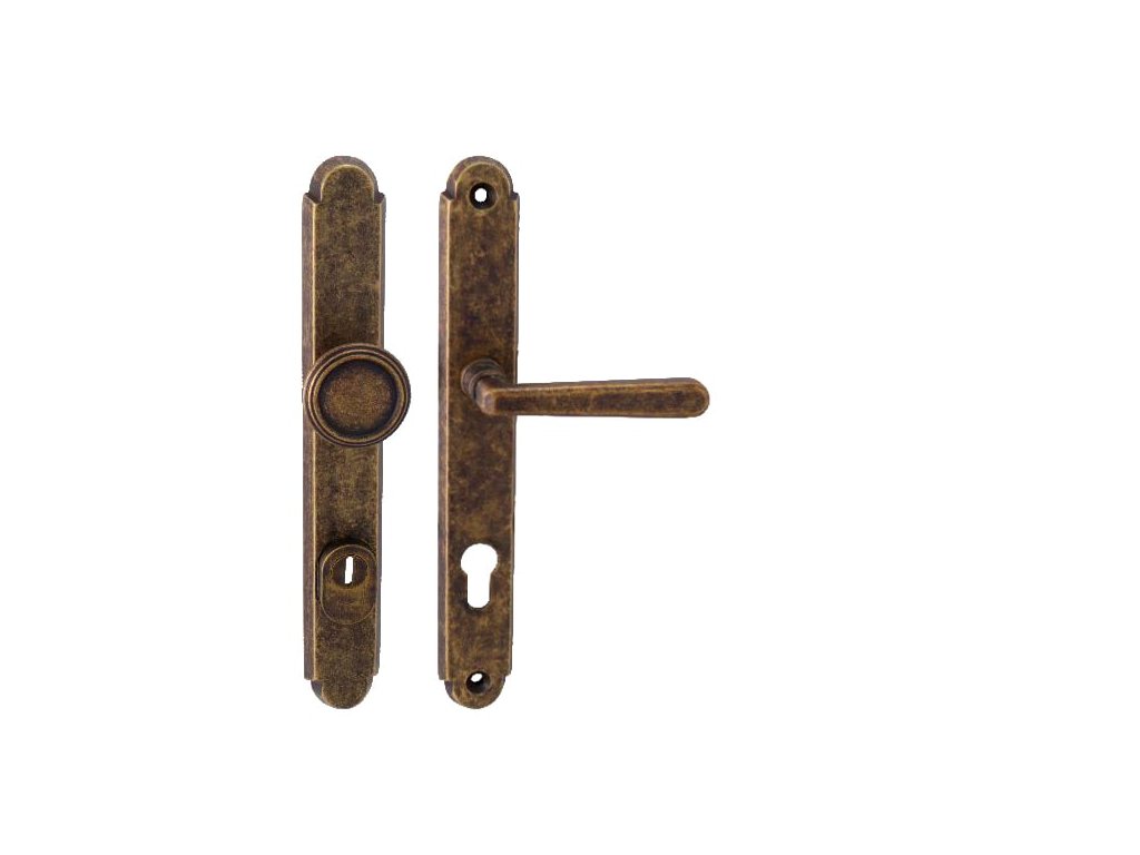 Štítová kľučka na vchodové a bezpečnostné dvere so spevneným rustikálnym štítom s prekrytím cylindrickej vložky je vyrobená z materiálov vysokej kvality – mosadz a je povrchovo upravená. Rustikálny štít má rozmery 38 mm x 280 mm a hrúbku 11 mm.