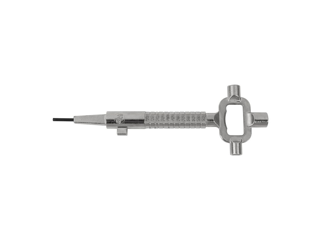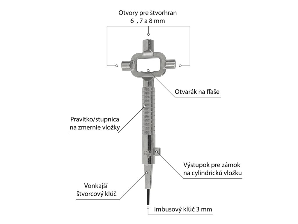Univerzálny multifunkčný zámočnícky kľúč je vyrobený z kvalitnej zliatiny zinku a preto je odolný voči korózii. Prostredníctvom integrovaného vonkajšieho štvorhranu umožňuje otvoriť dvere ak vypadla kľučka. V prípade, že by ste museli odstrániť z dverí cylindrickú vložku, otvoríte ich pomocou otváracieho výstupku. Následne si pomocou meradla na multifunkčnom kľúči zmeriate rozmer potrebnej vložky.