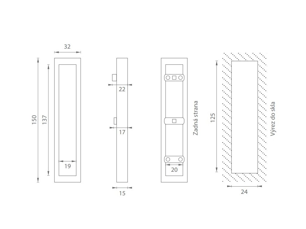 Hranatá mušľa na sklo bez otvoru je vyrobená z materiálov vysokej kvality – zamak a je povrchovo upravená. Mušľa má výšku 150 mm, šírku 32 mm, zádlab 15 mm a celkovú hrúbku 22 mm. Upevnenie skrutkou - Súčasťou balenia je sada skrutiek na preskrutkovanie cez dvere. Pri objednávke je potrebné uviesť hrúbku skla pre správnu podložku v rozmere 6, 8, 10 a 12 mm. Cena je uvedená za pár.