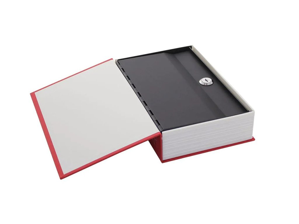 Elegantná uzamykateľná príručná pokladnica maskovaná do podoby knihy je vyrobená z ocele a je povrchovo upravená. Pokladnička má rozmery v/š/h : 24,5 cm / 15,5 cm / 5,5 cm. Zámok nie je viditeľný.