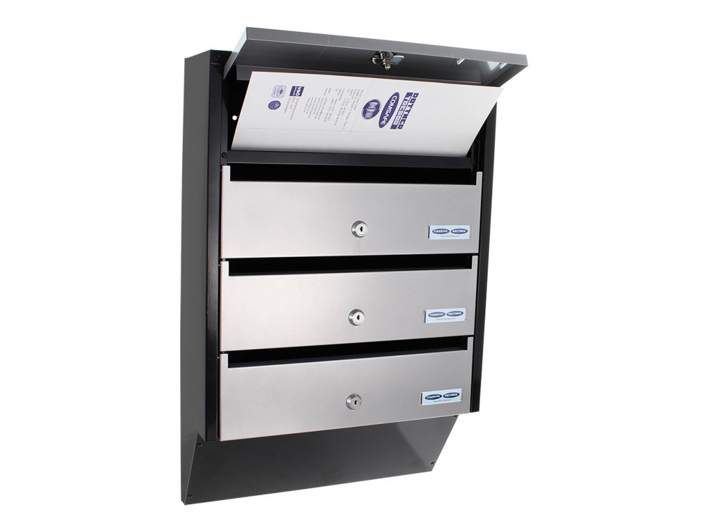 Poštová schránka DEPOT 4 obsahuje 4 samostatné priečinky. Každý priečinok je možné uzamknúť a ku každému priečinku sa dodávajú 2 kľúče. Jednotlivé priečinky majú v pravej dolnej časti priestor na menovku a veľké predné dvierka na výber doručenej pošty, ktoré sa otvárajú smerom dohora. Poštová schránka Depot 4 je vhodná pre bytové domy a polyfunkčné objekty. Schránky je možné rozširovať pridaním ďalších rovnakých schránok. Na zadnej strane sú pripravené otvory na upevnenie. Materiál na upevnenie je súčasťou balenia.